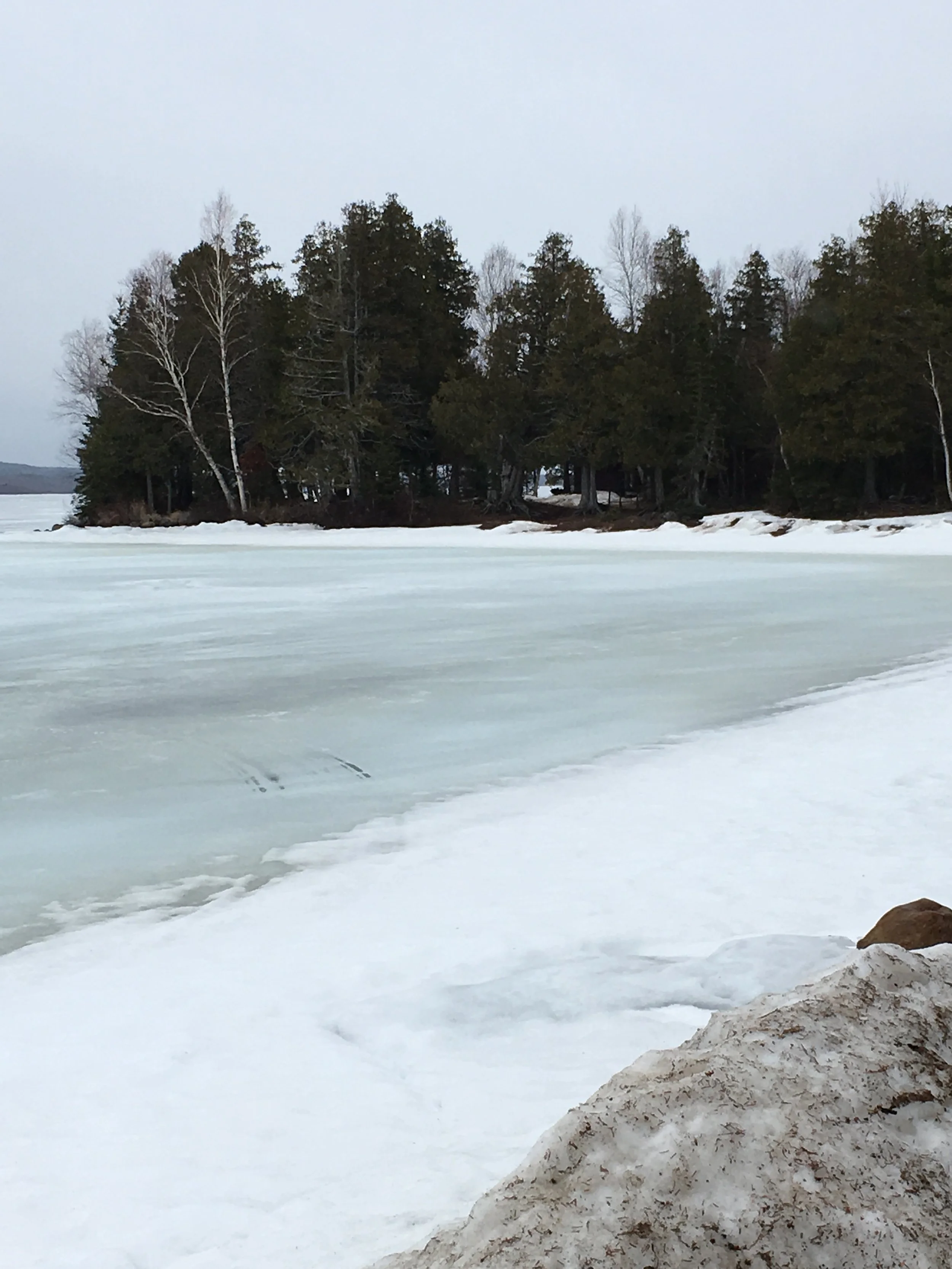 The number one question each spring is When Will the Ice Go Out? There is no good way to predict this (we are always proven wrong if we try that), but one of the factors I watch is the color of the ice. This was my first glimpse of the lake when I was returning. That it is not a pure white is a good sign. The ice goes from white to grey to black, and that represents various stages of decay. To see the beginnings of grey tells me that we are moving in the right direction, but not too quickly. On a side note, can one Ever grow tired of this iconic view??